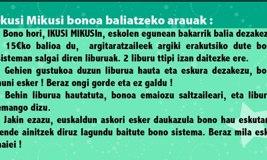 Horretarako BONO sistema bat martxan jarri dugu: ikasle bakoitzak bono bat eskuratuko du Sarara ailegatzean, eta bono hunekin, gehien maite duen liburua eraman ahalko du etxera!